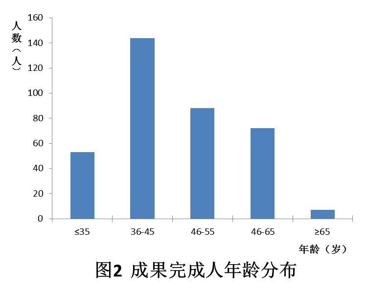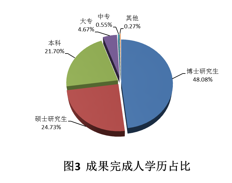 2021年登記的科技成果涉及完成人共364人,平均每個項目有約25個人參與。從年齡結(jié)構(gòu)上來看(圖2),以36-45歲的中青年為主要科研力量,共144人,占比總?cè)藬?shù)的39.6%;小于35歲(含35歲)的成果完成人為53人,占比總?cè)藬?shù)的14.6%;46-55歲的成果完成人為88人,占比總?cè)藬?shù)的24.2%。從學(xué)歷構(gòu)成看(圖3),以博士研究生學(xué)歷為主,共有175人,占比達到48.08%,其次是碩士研究生和本科學(xué)歷,占比分別為24.73%和21.70%。從職稱構(gòu)成看(圖4),高級職稱人員最多,共有256人,占完成人總數(shù)的70.33%,其中正高級人員占比38.46%、副高級人員占比31.87%;中級從業(yè)科技人員占比完成人總數(shù)的17.58%,多數(shù)為35歲以下的青年科技人員??傮w來看,成果研究人員本科及以上學(xué)歷人員占比達94.51%,中高級職稱人員占比成果完成人的87.91%,科研隊伍結(jié)構(gòu)日趨合理、科技支撐能力建設(shè)日益加強。