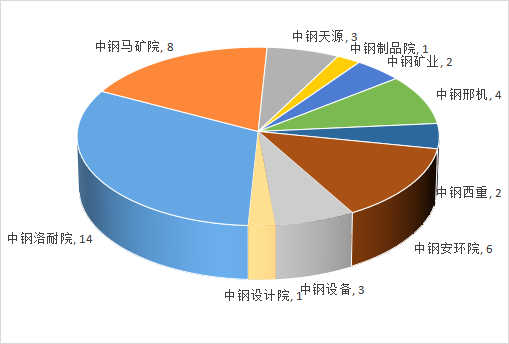 截止2021年末,中鋼集團(tuán)所屬企業(yè)累計(jì)登記入庫(kù)科技成果44項(xiàng),其中中鋼洛耐院14項(xiàng)、中鋼礦院8項(xiàng),占據(jù)2021年集團(tuán)新增科技成果數(shù)量的50%(如圖1所示)。