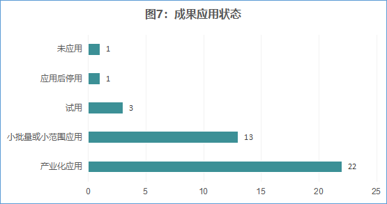 成果應(yīng)用狀態(tài)主要以產(chǎn)業(yè)化應(yīng)用為主,產(chǎn)業(yè)化率高達(dá)62.5%。應(yīng)用后停用的成果有1項(xiàng),主要原因來(lái)自于市場(chǎng)因素;未應(yīng)用的成果有1項(xiàng),主要原因來(lái)自于管理因素。具體數(shù)據(jù)詳見(jiàn)圖7。