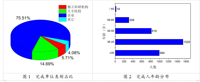 2020年登記的科技成果涉及完成人共3666人,平均每個(gè)項(xiàng)目有15人參與。如圖2所示,36-45歲的中青年為主要科研力量,共1529人,占比總?cè)藬?shù)的41.71%;小于35歲(含35歲)的成果完成人為994人,占比總?cè)藬?shù)的27.11%;46-55歲的成果完成人為816人,占比總?cè)藬?shù)的22.26%。從學(xué)歷構(gòu)成看(圖3),博士研究生、碩士研究生、本科和其他學(xué)歷占比分別為21.82%、35.00%、37.18%和6.00%。從職稱構(gòu)成看(圖4),高級(jí)職稱人員占比完成人總數(shù)的53.68%,其中正高級(jí)人員(含院士4人)占比21.19%、副高級(jí)人員占比32.49%;中級(jí)從業(yè)科技人員占比完成人總數(shù)的33.58%,多數(shù)為35歲以下的青年科技人員??傮w來(lái)看,成果研究人員本科及以上學(xué)歷人員占比達(dá)94.00%,中高級(jí)職稱人員占比成果完成人的87.26%,科研隊(duì)伍結(jié)構(gòu)日趨合理、科技支撐能力建設(shè)日益加強(qiáng)。