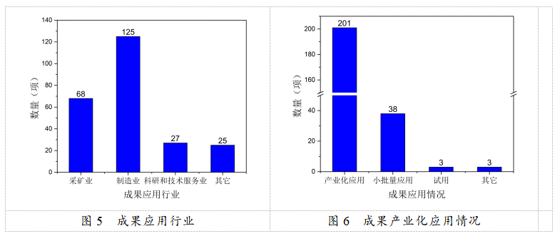 從成果應(yīng)用行業(yè)來(lái)看(圖5),主要應(yīng)用于制造業(yè),達(dá)125項(xiàng),占比登記成果總數(shù)的51.02%;采礦業(yè)、科研和技術(shù)服務(wù)業(yè)分別為68項(xiàng)、27項(xiàng),分別占比登記成果總數(shù)的27.76%、11.02%。2021年登記的科技成果中,成果處于初期階段4項(xiàng)、中期階段9項(xiàng)、成熟應(yīng)用階段232項(xiàng),其中201項(xiàng)成果已產(chǎn)業(yè)化應(yīng)用(圖6),占比登記成果總量的82.04%,成熟階段的項(xiàng)目大多投入產(chǎn)業(yè)化應(yīng)用。