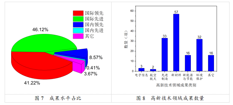 2021年登記的科技成果中,原始性創(chuàng)新205項(xiàng),國(guó)外引進(jìn)消化吸收創(chuàng)新12項(xiàng),國(guó)內(nèi)技術(shù)二次開(kāi)發(fā)25項(xiàng)。從成果水平來(lái)看(圖7),國(guó)際領(lǐng)先項(xiàng)目101項(xiàng),占比登記總數(shù)的41.22%,國(guó)際先進(jìn)項(xiàng)目113項(xiàng),占比登記總數(shù)的46.12%,國(guó)際水平成果整體占比登記成果總數(shù)的八成以上。2020年登記的科技成果中,156個(gè)項(xiàng)目屬于高新技術(shù)領(lǐng)域成果,其中新材料、先進(jìn)制造、環(huán)境保護(hù)數(shù)量較多,分別為44項(xiàng)、32項(xiàng)、34項(xiàng)(圖8)。