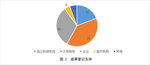 獨立科研機構(gòu)有37項,比上年增加20項,同比增長117.65%;大專院校有75項,比上年減少11項,同比下降12.79%;企業(yè)有62項,比上年減少11項,同比下降15.07%;醫(yī)療機構(gòu)有8項,比上年減少4項,同比下降33.33%;其他單位有11項,與上年持平。