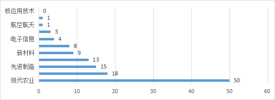 電子信息有4項,比上年減少9項,同比下降69.23%;先進制造有15項,比上年減少2項,同比下降11.76%;航空航天有1項,比上年減少2項,同比下降66.67%;現(xiàn)代交通有3項;生物醫(yī)藥與醫(yī)療器械有18項,比上年減少5項,同比下降21.74%;新材料有9項,比上年減少2項,同比下降18.18%;新能源與節(jié)能有13項,比上年增加7項,同比增長116.67%;環(huán)境保護有8項,與上年持平;地球、空間與海洋有1項,比上年減少1項,同比下降50.00%;現(xiàn)代農(nóng)業(yè)有50項,比上年增加10項,同比增長25.00%。