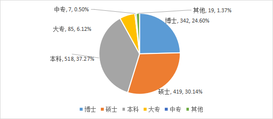 成果完成人情況有1390人次,比上年減少92人次,同比下降6.21%。按學(xué)歷分:博士有342人次,比上年減少42人次,同比下降10.94%;碩士有419人次,比上年增加29人次,同比增長7.44%;本科有518人次,比上年減少47人次,同比下降8.32%;大專有85人次,比上年減少19人次,同比下降18.27%;中專有7人次,比上年減少2人次,同比下降22.22%;其他學(xué)歷有19人次,比上年減少11人次,同比下降36.67%。