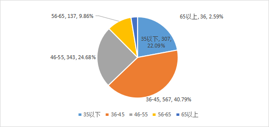 按年齡分:35歲以下(含35歲)有307人次,比上年減少94人次,同比下降23.44%; 36-45歲有567人次, 比上年減少21人次,同比下降3.57%;46-55歲有343人次,比上年增加15人次,同比增長4.57%;56-65歲有137人次,比上年減少5人次,同比下降3.52%; 65歲以上有36人次,比上年增加13人次,同比增長56.52%。