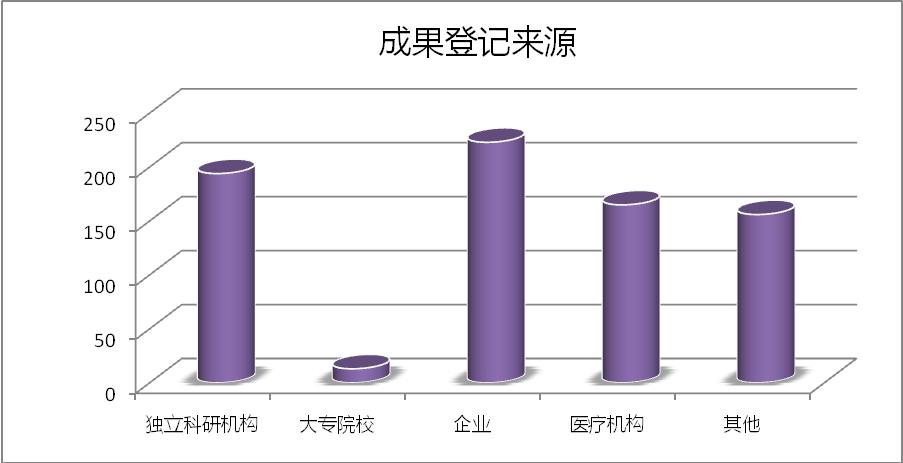 成果登記來(lái)源有獨(dú)立科研機(jī)構(gòu)、大專院校、企業(yè)、醫(yī)療機(jī)構(gòu)和其他行業(yè),其中,獨(dú)立科研機(jī)構(gòu)194項(xiàng),占總量的25.8%;大專院校13項(xiàng),占總量的1.7%;企業(yè)223項(xiàng),占總量的29.7%;醫(yī)療機(jī)構(gòu)165項(xiàng),占總量的22.0%;其他156項(xiàng),占總量的20.8%。