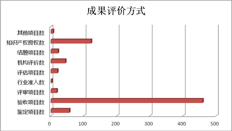 成果評(píng)價(jià)方式有鑒定、驗(yàn)收、評(píng)審、行業(yè)準(zhǔn)入、評(píng)估、機(jī)構(gòu)評(píng)價(jià)、結(jié)題、知識(shí)產(chǎn)權(quán)授權(quán)和其他,其中,驗(yàn)收項(xiàng)目459項(xiàng),占總量的61.1%;知識(shí)產(chǎn)權(quán)授權(quán)項(xiàng)目122項(xiàng),占總量的16.2%;鑒定項(xiàng)目56項(xiàng),占總量的7.5%;機(jī)構(gòu)評(píng)價(jià)項(xiàng)目為44項(xiàng),占總量的5.9%;評(píng)審項(xiàng)目18項(xiàng);行業(yè)準(zhǔn)入項(xiàng)目為3項(xiàng);評(píng)估項(xiàng)目為20項(xiàng);結(jié)題項(xiàng)目22項(xiàng);其他項(xiàng)目7項(xiàng)。