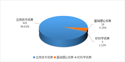 在所登記的447項科技成果中,應用技術成果423項,占成果登記總數(shù)的94.63%;基礎理論成果19項,占成果登記總數(shù)的4.25%;軟科學成果5項,占成果登記總數(shù)的1.12%。在登記的成果中仍然以應用技術成果為主。