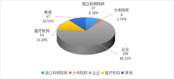 在所登記的447項科技成果中,按第一完成單位統(tǒng)計,獨立科研院所37項,占全省科技成果登記總數(shù)的8.28%;大專院校8項,占全省科技成果登記總數(shù)的1.79%;企業(yè)296項,占全省科技成果登記總數(shù)的66.22%;醫(yī)療機構59項,占全省科技成果登記總數(shù)的13.20%;其他47項,占全省科技成果登記總數(shù)的10.51%。企業(yè)獲得成果所占比例最高。