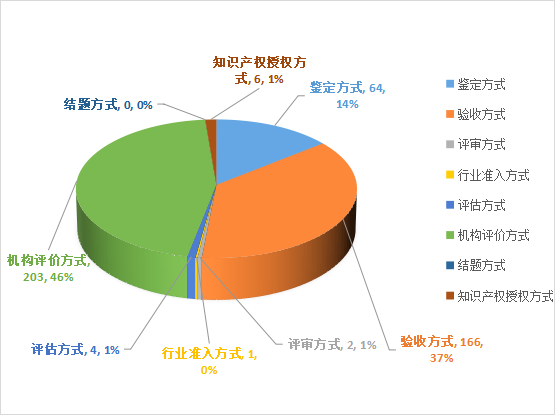 在所登記的447項科技成果中,鑒定方式64項,占成果登記總數(shù)的14.32%;驗收方式166項,占成果登記總數(shù)的37.14%;評審方式2項,占成果登記總數(shù)的0.45%;行業(yè)準入方式1項,占成果登記總數(shù)的0.22%;評估方式4項,占成果登記總數(shù)的0.89%;機構評價方式203項,占成果登記總數(shù)的45.41%;結題方式0項,占成果登記總數(shù)的0.00%;知識產(chǎn)權授權方式6項,占成果登記總數(shù)的1.34%。其他項目數(shù)1項,占成果登記總數(shù)的0.22%本年度年成果評價方式主要以機構評價方式為主。