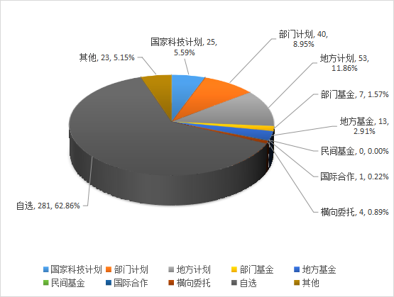 在所登記的447項科技成果中,各級政府計劃和基金項目產(chǎn)生的成果138項,占登記成果總數(shù)的30.87%。其中國家科技計劃25項,部門計劃40項,地方計劃53項,部門基金7項,地方基金13項。其他來源科技項目產(chǎn)生的成果309項,占登記成果總數(shù)的69.13%。其中民間基金0項,國際合作1項,橫向委托4項,自選281項,其他23項。