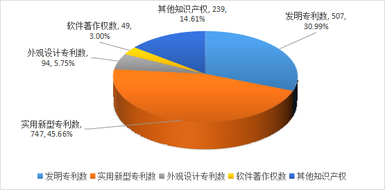 在所登記的447項科技成果中共擁有知識產(chǎn)權1636件,其中發(fā)明專利數(shù)507件,占比30.99%;實用新型專利數(shù)747件,占比45.66%;外觀設計專利數(shù)94件,占比5.75%;軟件著作權數(shù)49件,占比3.00%;其他知識產(chǎn)權239件,占比14.61%。已授權專利數(shù)1197件。
