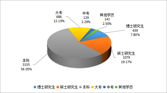 在所登記的447項科技成果中,按科技成果完成人員文化程度統(tǒng)計:博士研究生439人,碩士研究生1079人,本科3155人,大專686人,中專129人,其他學歷141人,成果完成人員學歷普遍較高,博士研究生和碩士研究生共計1518人,占完成人員總數(shù)的26.97%,本科占56.05%。