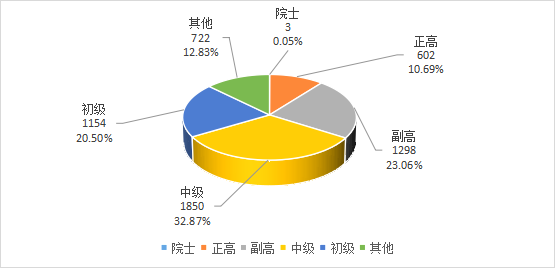 在所登記的447項科技成果中,按科技成果完成人員職稱統(tǒng)計:院士3人,占0.05%;正高602人,占10.69%;副高1298人,占23.06%;中級1850人,占32.87%;初級1154人,占20.50%;其他722人,占12.83%。從技術職稱分布看,具備正高、副高、中級職稱的研究人員占比達66.67%。