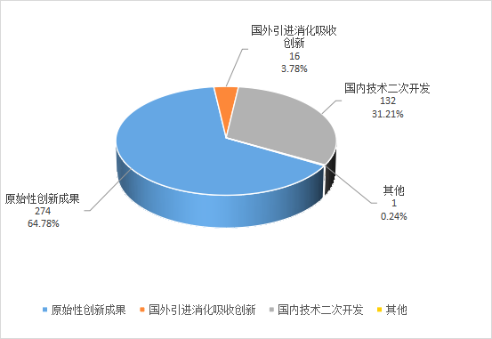 在所登記的423項應用技術成果中,原始性創(chuàng)新成果274項,占64.78%;國外引進消化吸收創(chuàng)新16項,占3.78%;國內(nèi)技術二次開發(fā)132項,占31.21%;其他1項,占0.24%。應用技術成果中仍以原始性創(chuàng)新成果為主。