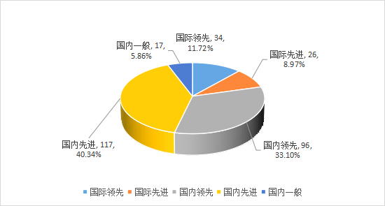 在所登記的423項應用技術成果中,共有290項成果進行了成果水平評價,占比為64.88%。其中,國際領先34項,占11.72%;國際先進26項,占8.97%;國內(nèi)領先96項,占33.10%;國內(nèi)先進117項,占40.34%;國內(nèi)一般17項,占5.86%。未評價133項,占31.44%;