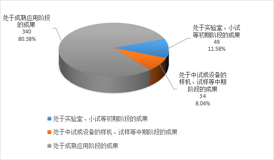 在所登記的423項應用技術成果中,處于處于實驗室、小試等初期階段的成果49項,占11.58%;處于中試或設備的樣機、試樣等中期階段的成果34項,占8.04%;處于成熟應用階段的成果340項,占80.38%。