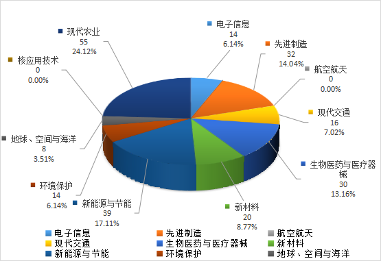 在所登記的423項應用技術成果中,屬于高新技術領域的228項,占應用技術成果的53.90%。其中電子信息14項,先進制造32項,航空航天0項,現(xiàn)代交通16項,生物醫(yī)藥與醫(yī)療器械30項,新材料20項,新能源與節(jié)能39項,環(huán)境保護14項,地球、空間與海洋8項,核應用技術0項,現(xiàn)代農(nóng)業(yè)55項。