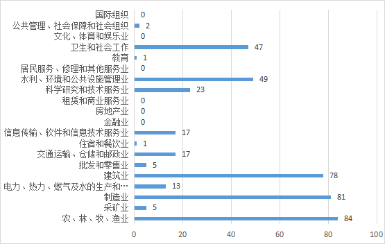 按技術成果實際推廣應用的行業(yè)分類進行統(tǒng)計,農(nóng)、林、牧、漁業(yè)84項,采礦業(yè)5項,制造業(yè)81項,電力、熱力、燃氣及水的生產(chǎn)和供應13項,建筑業(yè)78項,批發(fā)和零售業(yè)5項,交通運輸、倉儲和郵政業(yè)17項,住宿和餐飲業(yè)1項,信息傳輸、軟件和信息技術服務業(yè)17項,金融業(yè)0項,房地產(chǎn)業(yè)0項,租賃和商業(yè)服務業(yè)0項,科學研究和技術服務業(yè)23項,水利、環(huán)境和公共設施管理業(yè)49項,居民服務、修理和其他服務業(yè)0項,教育1項,衛(wèi)生和社會工作47項,文化、體育和娛樂業(yè)0項,公共管理、社會保障和社會組織2項,國際組織0項。