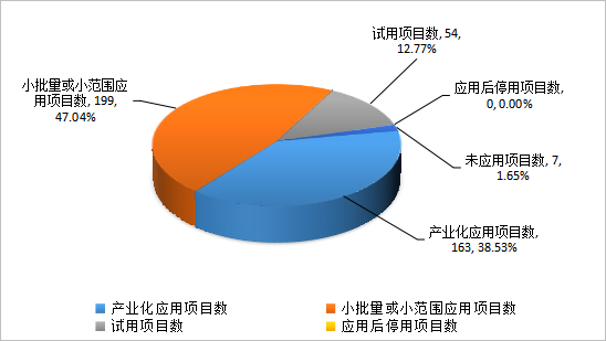 在所登記的423項應用技術成果中,產(chǎn)業(yè)化應用項目數(shù)163項,占所登記應用技術成果的38.53%;小批量或小范圍應用項目數(shù)199項,占所登記應用技術成果的47.04%;試用項目數(shù)54項,占所登記應用技術成果的12.77%;應用后停用項目數(shù)0項,占所登記應用技術成果的0.00%;未應用項目數(shù)7項,占所登記應用技術成果的1.65%。