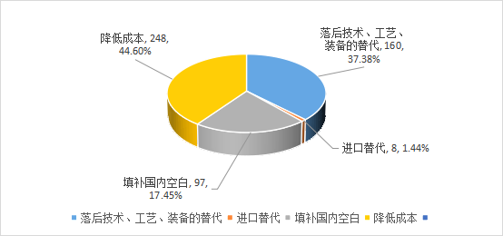 在所登記的應用技術成果中轉(zhuǎn)化項目數(shù)共有74項,共產(chǎn)生428項實際應用效果,其中:落后技術、工藝、裝備的替代160項,占37.38%;進口替代4項,占0.93%;填補國內(nèi)空白93項,占21.73%;降低成本171項,占39.95%。