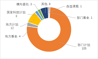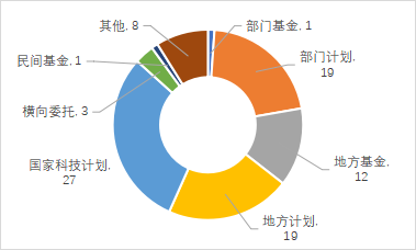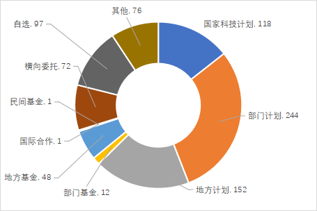 科技成果以財(cái)政支持的課題來(lái)源為主。來(lái)自國(guó)家科技計(jì)劃,部門(mén)計(jì)劃,地方計(jì)劃及部門(mén)基金和地方基金等財(cái)政支持的科技成果574項(xiàng),占登記成果總量的69.91%。其中,部門(mén)計(jì)劃、地方計(jì)劃和國(guó)家科技計(jì)劃登記科技成果數(shù)量遠(yuǎn)高于其他課題來(lái)源,分別占登記科技成果總量的29.72%、18.51%和14.37%。
