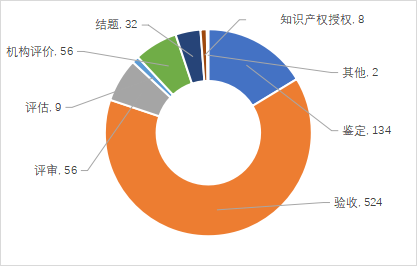 2022年度登記的非涉密成果中,驗(yàn)收項(xiàng)目524項(xiàng),占比63.82%;鑒定項(xiàng)目134項(xiàng),占比16.32%;評(píng)審項(xiàng)目56項(xiàng),占比6.82%;機(jī)構(gòu)評(píng)價(jià)56項(xiàng),占比6.82%;結(jié)題項(xiàng)目32項(xiàng),占比3.90%;評(píng)估項(xiàng)目9項(xiàng),占比1.10%;知識(shí)產(chǎn)權(quán)授權(quán)8項(xiàng),占比0.97%;未登記行業(yè)準(zhǔn)入。