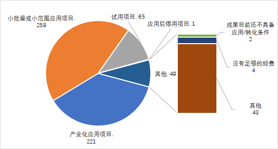 應(yīng)用技術(shù)成果中,小批量或小范圍應(yīng)用的科技成果所占比例最高,為43.43%,產(chǎn)業(yè)化應(yīng)用的科技成果占比37.21%,試用的科技成果占比10.94%,未應(yīng)用、應(yīng)用后停用的科技成果所占比例不高,分別為8.25%和0.17%。