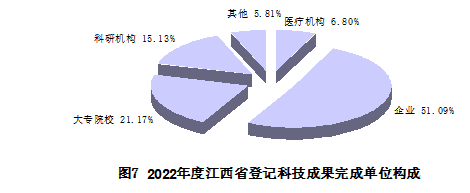 2022年度全省登記的科技成果中,按第一完成單位屬性分,企業(yè)登記數(shù)所占比例最大,共871項(xiàng),占51.09%;其次是大專院校361項(xiàng),占21.17%,獨(dú)立科研機(jī)構(gòu)258項(xiàng),占15.13%,醫(yī)療機(jī)構(gòu)116項(xiàng),占6.80%,其他單位99項(xiàng),占5.81%。數(shù)據(jù)顯示,2022年我省科技成果主要分布在企業(yè)、大專院校,在成果第一完成單位中所占比例為本年度登記成果完成單位的72.26%,凸顯了企業(yè)與大專院校在我省科技創(chuàng)新中的主體地位(見(jiàn)圖7)。