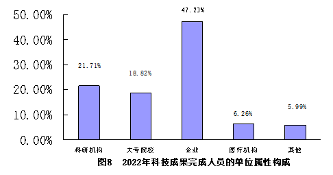 2022年度登記的科技成果涉及到的完成人員共12078人次。以單位屬性看,企業(yè)和獨(dú)立科研機(jī)構(gòu)的科技人員最多。其中,企業(yè)科技人員5704人次,占47.23%;科研機(jī)構(gòu)科技人員2622人,占21.71%;大專院??萍既藛T2273人,占18.82%;醫(yī)療機(jī)構(gòu)科技人員756人,占6.26%;其他723人,占5.99%(見(jiàn)圖8)。
