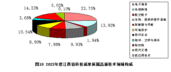 2022年度江西省登記的1440項(xiàng)應(yīng)用技術(shù)成果中,有977項(xiàng)屬高新技術(shù)領(lǐng)域,占登記的科技成果總數(shù)的57.30%。其中,電子信息232項(xiàng),占所登記的高新技術(shù)領(lǐng)域成果總量的23.75%;先進(jìn)制造136項(xiàng),占13.92%;航空航天19項(xiàng),占1.94%;現(xiàn)代交通49項(xiàng),占5.02%;生物醫(yī)藥和醫(yī)療器械97項(xiàng),占9.93%;新材料139項(xiàng),占14.23%;新能源與節(jié)能78項(xiàng),占7.98%;環(huán)境保護(hù)87項(xiàng),占8.90%;地球、空間與海洋36項(xiàng),占3.68%;核應(yīng)用技術(shù)1項(xiàng),占0.10%;現(xiàn)代農(nóng)業(yè)103項(xiàng),占10.54%。電子信息領(lǐng)域在全省高新技術(shù)領(lǐng)域中所占比例最高,其次新材料和先進(jìn)制造也都占有較大比例( 見(jiàn)圖10)。