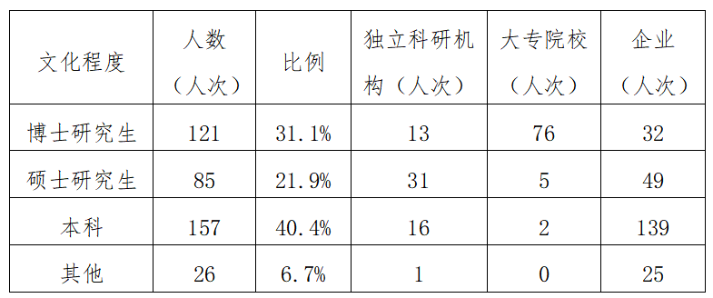從學(xué)歷層次看,科技成果完成人員中,擁有博士研究生學(xué)歷的共121人次,占登記人員總數(shù)的31.1%;擁有碩士研究生學(xué)歷的共85人次,占登記總?cè)?/span>次21.9%;擁有本科學(xué)歷的共157人次,占登記總?cè)藬?shù)40.4%。(見表5)