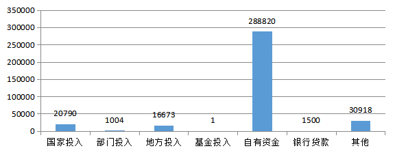 進行登記的科技成果,經(jīng)費實際投入總額為359706萬元,其中,國家投入20790萬元,部門投入1004萬元,地方投入16673萬元,基金投入1萬元,自有資金288820萬元,銀行貸款1500萬元,其他資金30918萬元(圖4)。