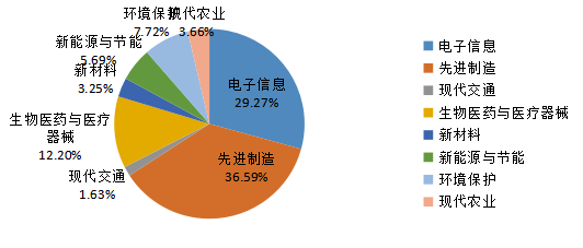 從成果所屬高新技術(shù)領(lǐng)域來看,主要集中在先進制造(90項)、電子信息(72項)、生物醫(yī)藥與醫(yī)療器械(30項)、環(huán)境保護(19項)、新能源與節(jié)能(14項)、現(xiàn)代農(nóng)業(yè)(9項)、新材料(8項)、現(xiàn)代交通(5項)(圖5)。