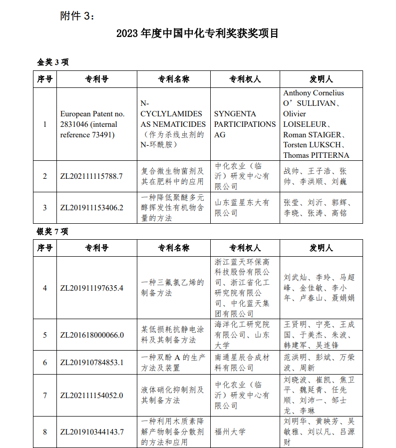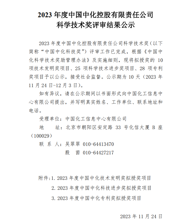 2023年度中國(guó)中化控股有限責(zé)任公司科學(xué)技術(shù)獎(jiǎng)評(píng)審結(jié)果公示