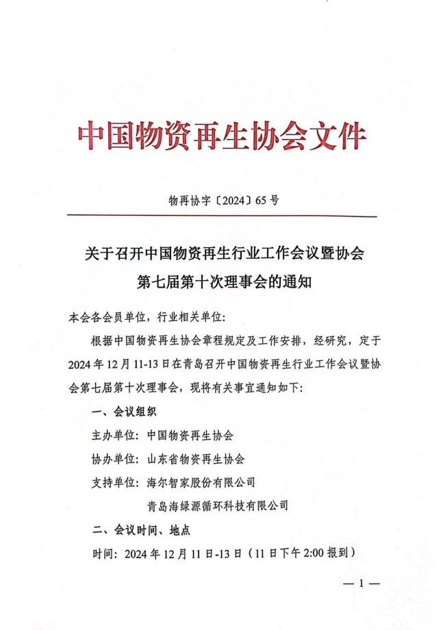 根據(jù)中國物資再生協(xié)會(huì)章程規(guī)定及工作安排,經(jīng)研究,定于2024年12月11-13日在青島召開中國物資再生行業(yè)工作會(huì)議暨協(xié)會(huì)第七屆第十次理事會(huì),現(xiàn)將有關(guān)事宜通知如下: