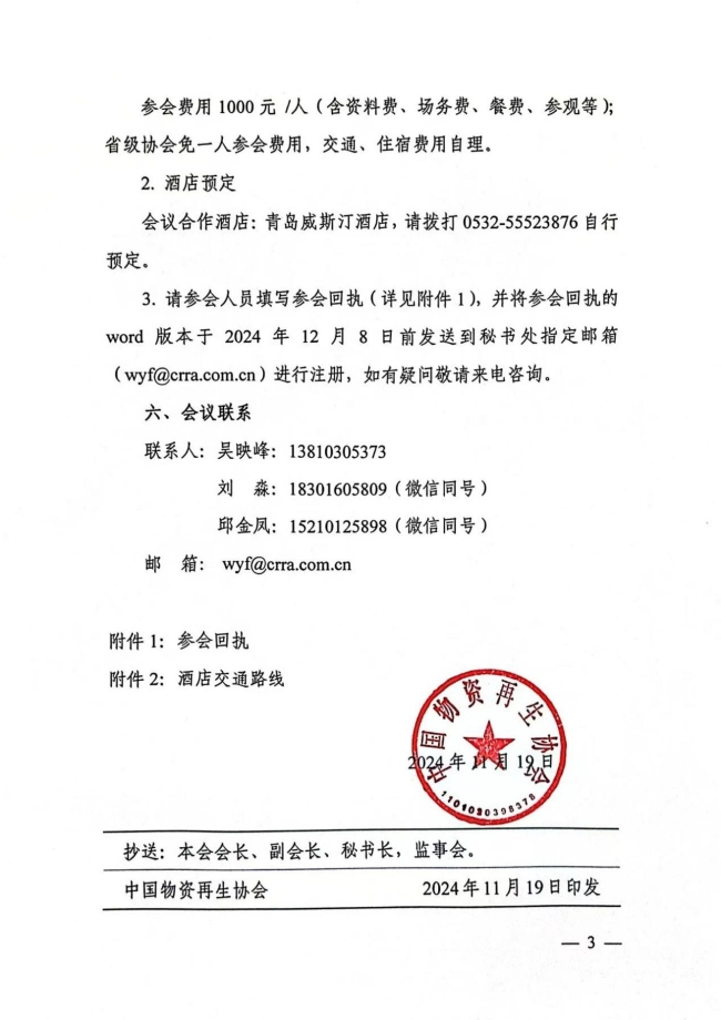 3. 請(qǐng)參會(huì)人員填寫參會(huì)回執(zhí)(詳見附件1),并將參會(huì)回執(zhí)的word版本于2024年12月8日前發(fā)送到秘書處指定郵箱(wyf@crra.com.cn)進(jìn)行注冊(cè),如有疑問敬請(qǐng)來電咨詢。